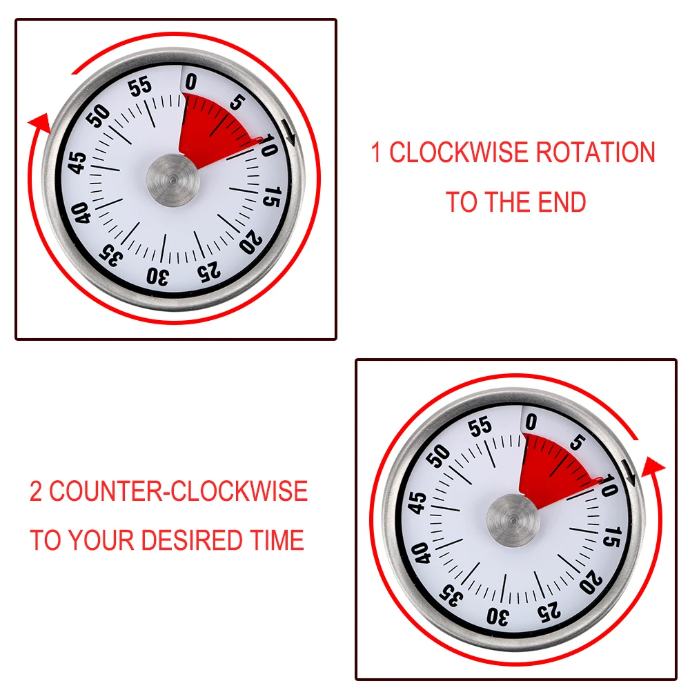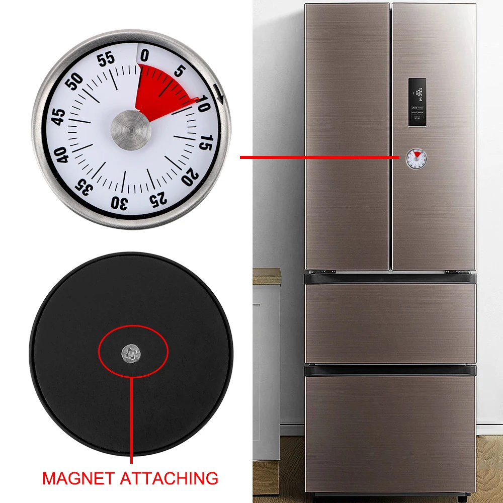 The 60-Minute Mechanical Kitchen Timer features a bold red dial that indicates remaining time, easy to read from even across the room. The extra strong magnet allows the user to set time with one hand. It also features long ring to ensure you notice when time is up.